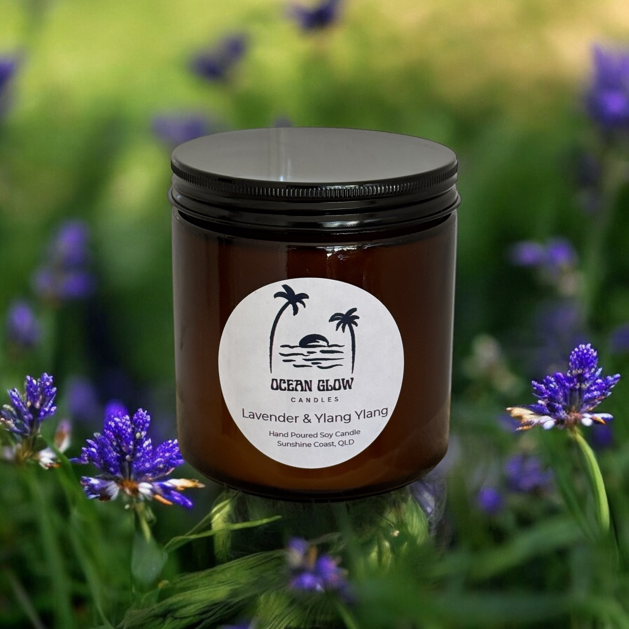 Each candle is elegantly housed in a stylish amber glass jar with a lid, adding a touch of sophistication to any space.